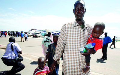 في الأثناء وصلت أول مجموعة من نحو 12 ألف سوداني جنوبي صدرت لهم أوامر بمغادرة السودان الشهر الماضي، اثر تفجر الصراع بين الجارتين، إلى جوبا عاصمة الجنوب، من خلال جسر جوي إنساني بدعم دولي. ونقلت طائرة مستأجرة 164 شخصا من الخرطوم إلى جوبا، وهي بداية لجسر جوي تنظمه المنظمة الدولية للهجرة لآلاف الجنوبيين الذين تقطعت بهم السبل في ميناء كوستي السوداني على النيل. وكان في استقبال أول المرحلين، ومعظمهم من النساء برفقة أطفال صغار وبعض الرجال، مسؤولون من المنظمة الدولية للهجرة، ومسؤولون من جنوب السودان ونقلوا في حافلات إلى مخيم استقبال على مشارف جوبا تديره المفوضية العليا لشؤون اللاجئين التابعة للامم المتحدة. وبينما كانت الحافلات تحمل الجنوبيين من المطار لوح بعض سكان جوبا لهم وابتسموا وزغردت مجموعة من النساء في تحية مبتهجة. وفي الشهر الماضي اتهمت السلطات السودانية في كوستي نحو 12 ألف سوداني جنوبي تجمعوا في المنطقة بتشكيل تهديد أمني وبيئي، وأمرتهم بالمغادرة.