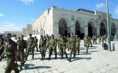 جنود الاحتلال خلال جولة في ساحة «الأقصى». أ.ف.ب