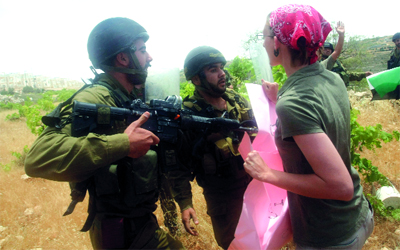 جنديان إسرائيليان يصدان ناشطة خلال احتجاج على الاستيطان قرب الخليل. أ.ف.ب