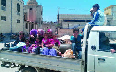 صورة بثتها شبكة شام تظهر عائلات تفر من بلدة الحولة بريف حمص مع استمرار العمليات العسكرية فيها. أ.ف.ب