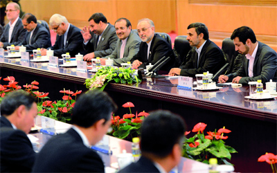 الرئيس الإيراني خلال مباحثاته مع الجانب الصيني في بكين. أ.ف.ب