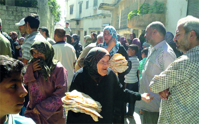 سوريون يصطفون للحصول على الخبز في بلدة الحولة التي شهدت مـــــــــــــــــــــــــــــــــجزرة قبل أيام. أ.ف.ب