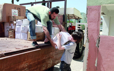 صبي سوري يساعد في إنزال المساعدات الطبيّة من شاحنة بإقليم هاتاي التركي. رويترز
