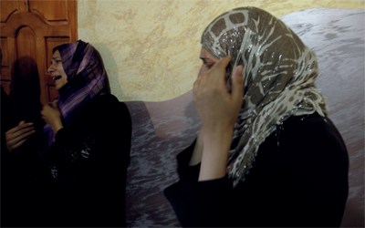 فلسطينيتان تبكيان أحد الشهداء خلال تشييعه في غزة. أ.ب