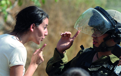فلسطينية من قرية النبي صالح تواجه جندياً إسرائيلياً خلال احتجاج ضد الاستيطان. أ.ف.ب