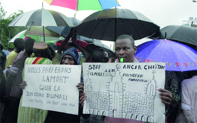 تظاهرة في مالي تحت المطر ضد هدم الأضرحة. أ.ب