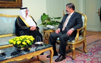 مرسي خلال استقباله السفير السعودي أحمد القطان. أ.ف.ب