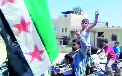 صورة بثتها «شبكة شام» تظهر جانباً من فرح أهالي إدلب بمقتل قادة «خلية الأزمة». أ.ب
