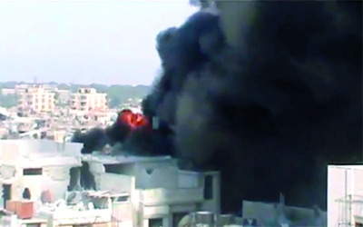 صورة بثتها شبكة شام تظهر اندلاع النار جراء قصف القوات السورية على حمص. أ.ب