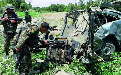جنود أفغان يتفحصون حطام سيارة نتيجة تفجير في شرق أفغانستان. أ.ف.بئ