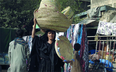 أفغانية تتكسب رزقها من بيع سلال يدوية. أ.ب