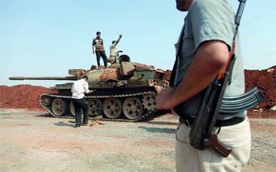 عناصر من «الجيش الحر» على ظهر دبابة استولوا عليها من القوات النظامية في عندان. أ.ف.ب