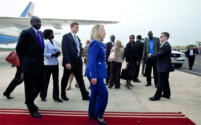 كلينتون أمضت في جوبا 3 ساعات قبل أن تعود إلى كمبالا. أ.ف.ب