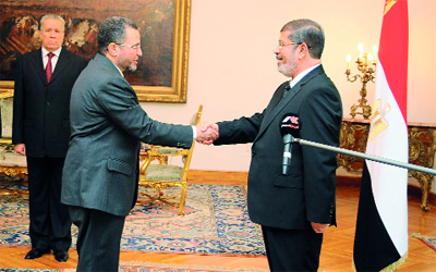 مرسي يصافح قنديل بعد إعلان الأخير تشكيلة حكومته الجديدة. أ.ف.ب