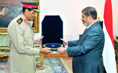 وقال الناطق الرسمي باسم رئاسة الجمهورية ياسر علي، إن مرسي أصدر قرارات بتعيين كل من اللواء طيار أركان حرب يونس السيد حامد المصري قائداً لسلاح الجو، واللواء أركان حرب عبدالمنعم بيومي قائداً لقوات الدفاع الجوي، واللواء أسامة أحمد أحمد الجندي قائداً للقوات البحرية. ونفى علي ما تردده بعض وسائل الإعلام، من أن الولايات المتحدة الأميركية كانت على علم بقرارات رئيس الجمهورية، بإجراء تغييرات بين قادة القوات المسلحة المصرية. وعرض التلفزيون المصري، أمس، لقطات لمرسي يمنح أوسمة لوزير الدفاع السابق المشير محمد حسين طنطاوي ورئيس هيئة الأركان السابق سامي عنان اللذين أحالهما للتقاعد. وعرض التلفزيون لقطات لطنطاوي، وهو يؤدي التحية لمرسي ويبتسم، ومنحه قلادة النيل كما قلد عنان وسام الجمهورية.