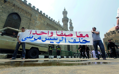 لافتة ترحب بمرسي قبيل صلاة الجمعة «اليتيمة» في الجامع الأزهر الشريف. أ.ب