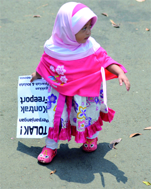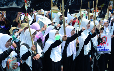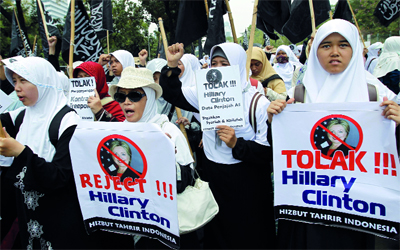 نظم نحو 500 ناشط إسلامي تجمعاً أمام السفارة الاميركية، للاحتجاج على زيارة وزيرة الخارجية الأميركية هيلاري كلنتون، معتبرين أن هدفها الترويج للمصالح الاميركية في مجال الاعمال، مثل منجم الذهب والنحاس الاميركي العملاق «فريبورت ماكموران» في اقليم بابوا.