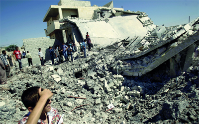 سوريون يقفون فـوق أنقاض منـزل دمـر بقصف القوات السوريـة على بلدة إعزاز شمال حلب. أ.ب