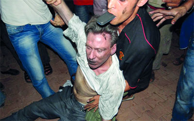 مدنيون ليبيون يحاولون إنقاذ الســـــــــــــــــــــــــــــــــفير الأميركي قبل وفاته. أ.ف.ب