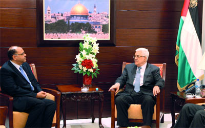 عباس خلال استقباله السفير المصري أمس في رام الله. إي.بي.إيه