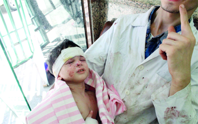 طفل يتلقى العلاج بعد إصابته في قصف نفذته القوات السورية على مدينة حلب. أ.ف.ب