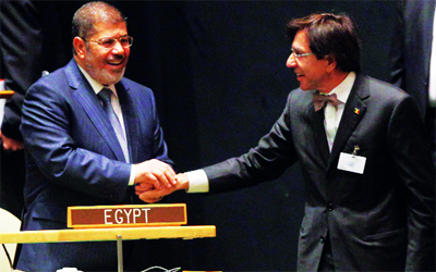 مرسي يصافح أحد المشاركين في اجتماعات الأمم المتحدة. أ.ب