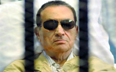 مبارك خلال إحدى جلسات محاكمته. أرشيفية