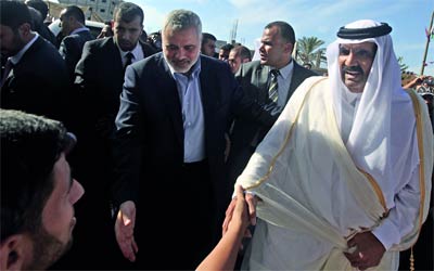 دخل أمير قطر، الشيخ حمد بن خليفة آل ثاني، قطاع غزة، أمس، في زيارة تاريخية، فيما أعلن رئيس الحكومة الفلسطينية المقالة، إسماعيل هنية، عن ارتفاع قيمة المنحة القطرية لإعادة إعمار غزة، إلى 400 مليون دولار، بعد موافقة الأمير على تمويل مشروعات إضافية، قائلاً ان زيارة امير قطر الى غزة تعتبر كسراً للحصار السياسي والاقتصادي، وسط انتقادات من الضفة الغربية للزيارة، التي تزامنت مع توغل اسرائيلي محدود جنوب القطاع.