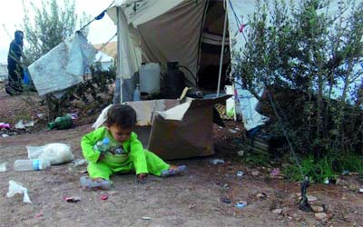 طفل يلهو في مخيم للاجئين قرب حدود تركيا. أ.ب