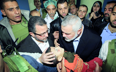 هنية وقنديل يحملان طفلاً استشهد في غارة إسرائيلية أثناء زيارتهما لمستشفى الشفاء. أ.ب