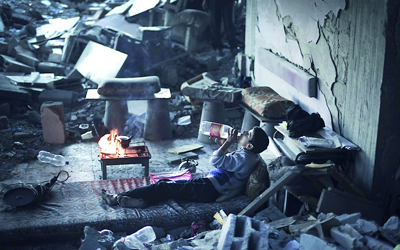 طفل فلسطيني يعيش بين أنقاض بيته في غزة. إي.بي.إيه