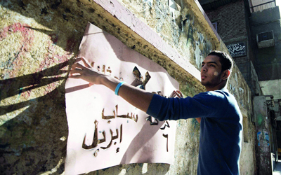 ناشط في حركة «6 أبريل» يقوم بكتابة دعاية تدعو بالتصويت بـ«لا» على الدستور. أ.ف.ب