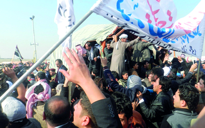 المتظاهرون قذفوا المطلك بالأحذية والحجارة على المنصة. أ.ف.ب