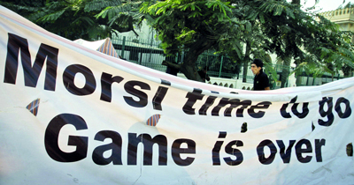 مصري يمر أمام لافته ضد مرسي أمام قصر الرئاسة بالقاهرة. أ.ف.ب