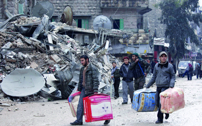 سوريون يغادرون منازلهم المدمّرة في حلب. رويترز