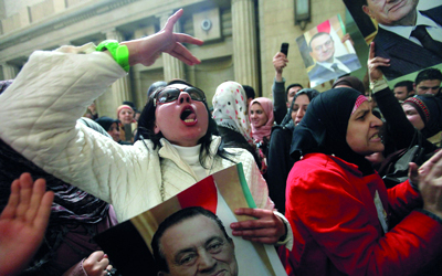 وردَّد المتظاهرون هتافات «الشعب يريد تكريم الرئيس»، و«يادي الذل ويادي العار أخ بيضرب أخوه بالنار»، ورفعوا صوراً لمبارك ولافتات تقول «أنا مصري أرفض إهانة مبارك»، و«مبارك هو الزعيم».