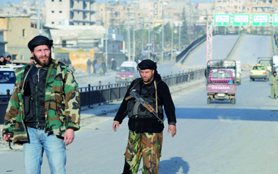 عنصران من الجيش الحر يراقبان الحركة في أحد شوارع حلب. أ.ف.ب