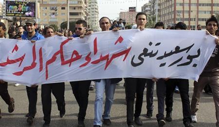اشخاص يحملون لافتة لدى حضورهم جنازة محتجين قتلوا في اعمال عنف في بورسعيد أمس - رويترز