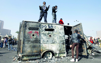محتجون فوق سيارة شرطة أحرقت خلال الاشتباكات في ميدان التحرير بالقاهرة. أ.ف.ب