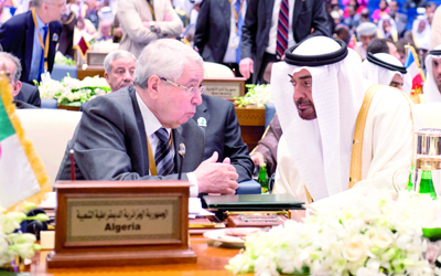 محمد بن زايد يتحدث مع رئيس مجلس الأمة الجزائري عبدالقادر بن صالح خلال الجلسة الافتتاحية «لمؤتمر المانحين» في الكويت. وام