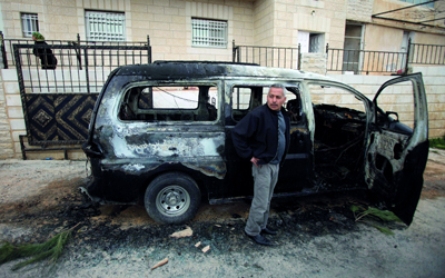 فلسطيني يقف بجوار سيارة أحرقها مستوطنون في قرية دير جرير. أ.ف.ب