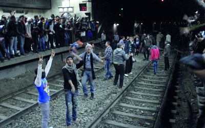 متظاهرون يقطعون خط المترو أمس. أ.ف.ب