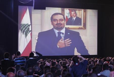 زعيم المعارضة اللبنانية سعد الحريري يحيي أنصاره في بيروت عبر دائرة تلفزيونية مغلقة من الرياض أمس - رويترز