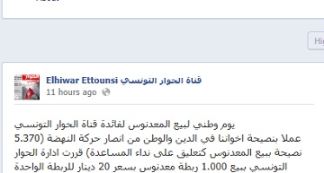 قررت قناة الحوار الفضائية التوسنية الخاصة العمل بنصيحة ساخرة لأنصار حزب حركة النهضة الإسلامية في تونس بتخصيص يوم وطني لبيع المعدنوس "البقدونس" أمام مقرها بهدف تجاوز ازمتها المالية.