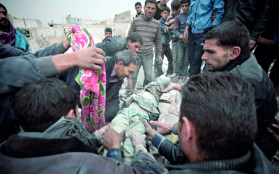انتشال جثة طفلة من وسط الركام الذي خلفه القصف الصاروخي على حلب. أ.ف.ب