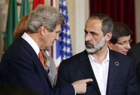 جون كيري يتحدث إلى زعيم الائتلاف الوطني السوري معاذ الخطيب في روما - رويترز