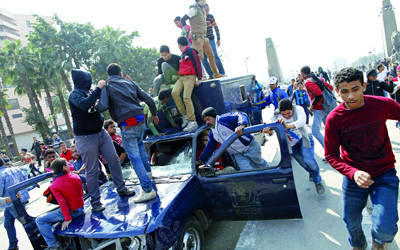 وقعت صدامات قرب ميدان التحرير في القاهرة، بين الشرطة ومئات المحتجين، امس، فيما أطلقت الشرطة المصرية أعيرة في الهواء والغاز المسيل للدموع خلال اشتباكات مع مئات المحتجين في بورسعيد، امس، في ثالث يوم من الاشتباكات العنيفة بالمدينة، فيما نظم عشرات الأشخاص في الخانكة، شمال القاهرة، وقفة احتجاجية أمام مبنى مجلس المدينة اعتراضاً على استيلاء خارجين على القانون على منازلهم. من جهتها قضت محكمة جنايات القاهرة بالسجن ثلاث سنوات على الملازم أول محمود الشناوي، الضابط بقطاع الأمن المركزي والمعروف إعلامياً بـ«قناص العيون».