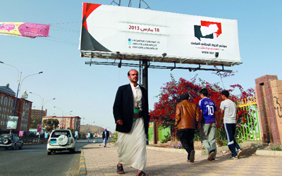 لافتات الحوار الوطني في شوارع العاصمة اليمنية صنعاء. أ.ف.ب