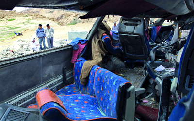 حطام حافلة المعتمرين الفلسطينيين بعد حادث التدهور جنوب عمان. رويترز