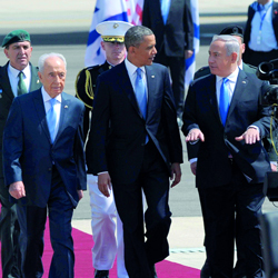 استهلّ الرئيس الأميركي، باراك أوباما، أمس، أول زيارة رسمية يقوم بها لإسرائيل، بالتأكيد على التزام الولايات المتحدة أمن اسرائيل والتحالف «الأبدي» بينهما، مشدداً على أن «السلام يجب أن يحل في الأرض المقدسة». فيما خرجت مسيرات حاشدة للفصائل الفلسطينية تندد بزيارة أوباما، وسط هتافات تدعو إلى وقف الاستيطان ومعاملة الشأن الفلسطيني بشكل عادل.